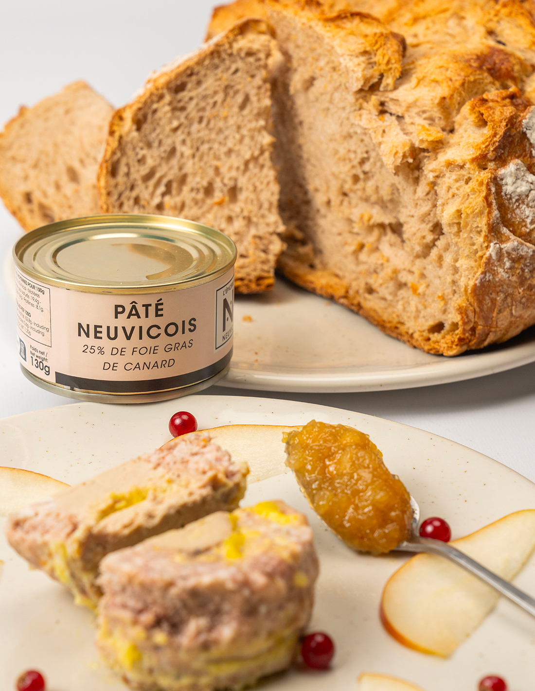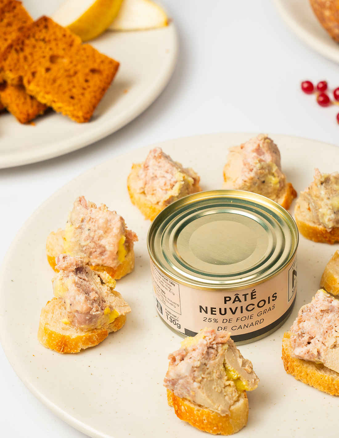 Die Pastete Neuvicois wird nach einem traditionellen Rezept aus dem Périgord hergestellt, das ein Symbol für die regionale Gastronomie ist. Sie kombiniert schmackhaftes, mit Cognac aromatisiertes Schweinefleisch mit einer Füllung aus Entenstopfleber, die ihr eine zartschmelzende und harmonische Textur verleiht.