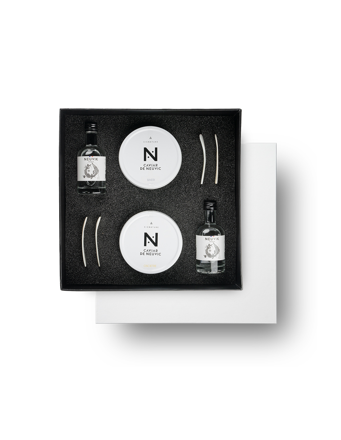 Entdecken Sie denBaeri-Kaviar Signaturemit seinen subtilen Butter- und Haselnussnoten. le Caviar Osciètre SignaturePerlmuttlöffel,, nobles et légères, accompagnent ce coffret pour préserver la texture et les qualités gustatives des oeufs dans un écrin prestigieux. La Der Wodka*Neuvik, accompagnera parfaitement ces 2 caviars.