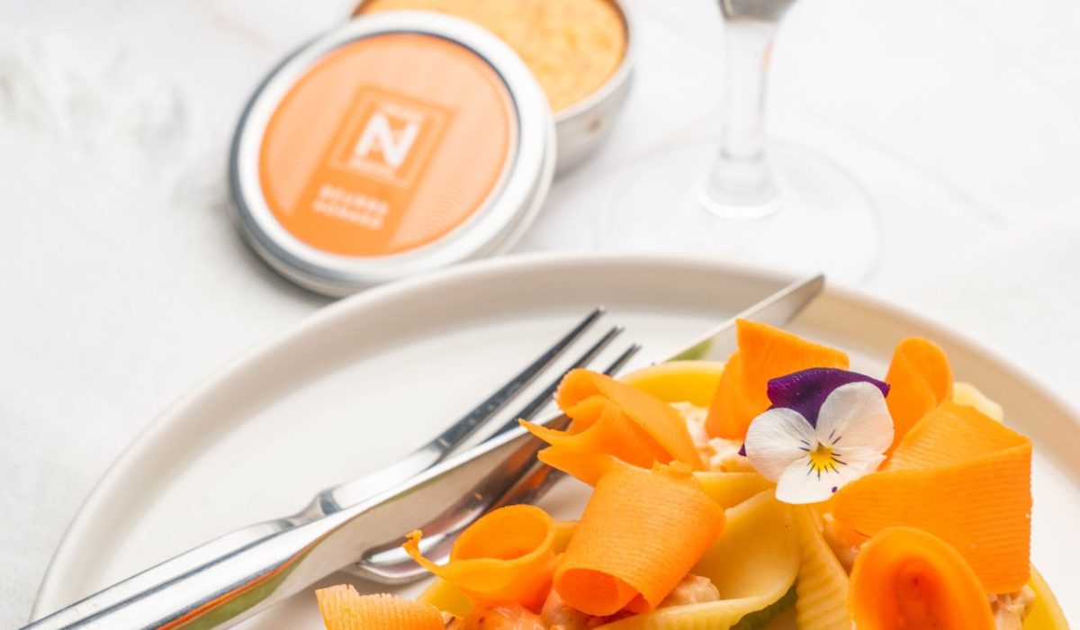 La receta contiene mantequilla y Caviar de Neuvic y ofrece un color y un sabor decididamente a caviar. La untuosidad de la mantequilla y la textura del caviar componen un bouquet de sabores sutiles y originales.