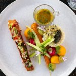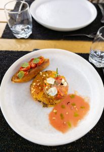 Tomate fumée aux herbes fraîches, tartare de tomate, sauce wasabi et sa tartine de tomates séchées.